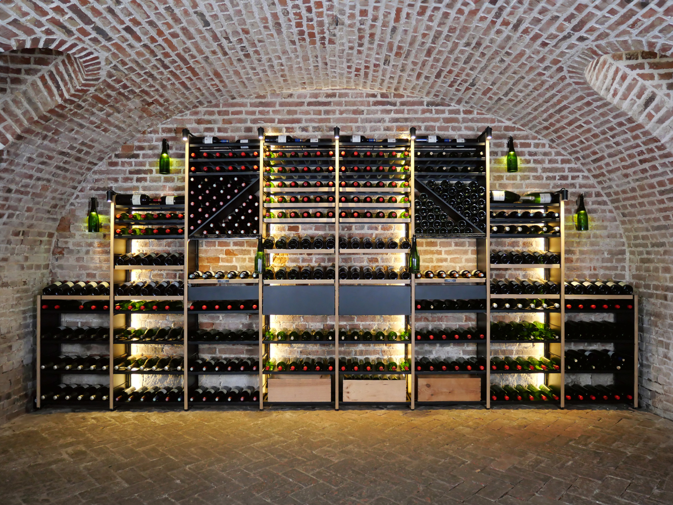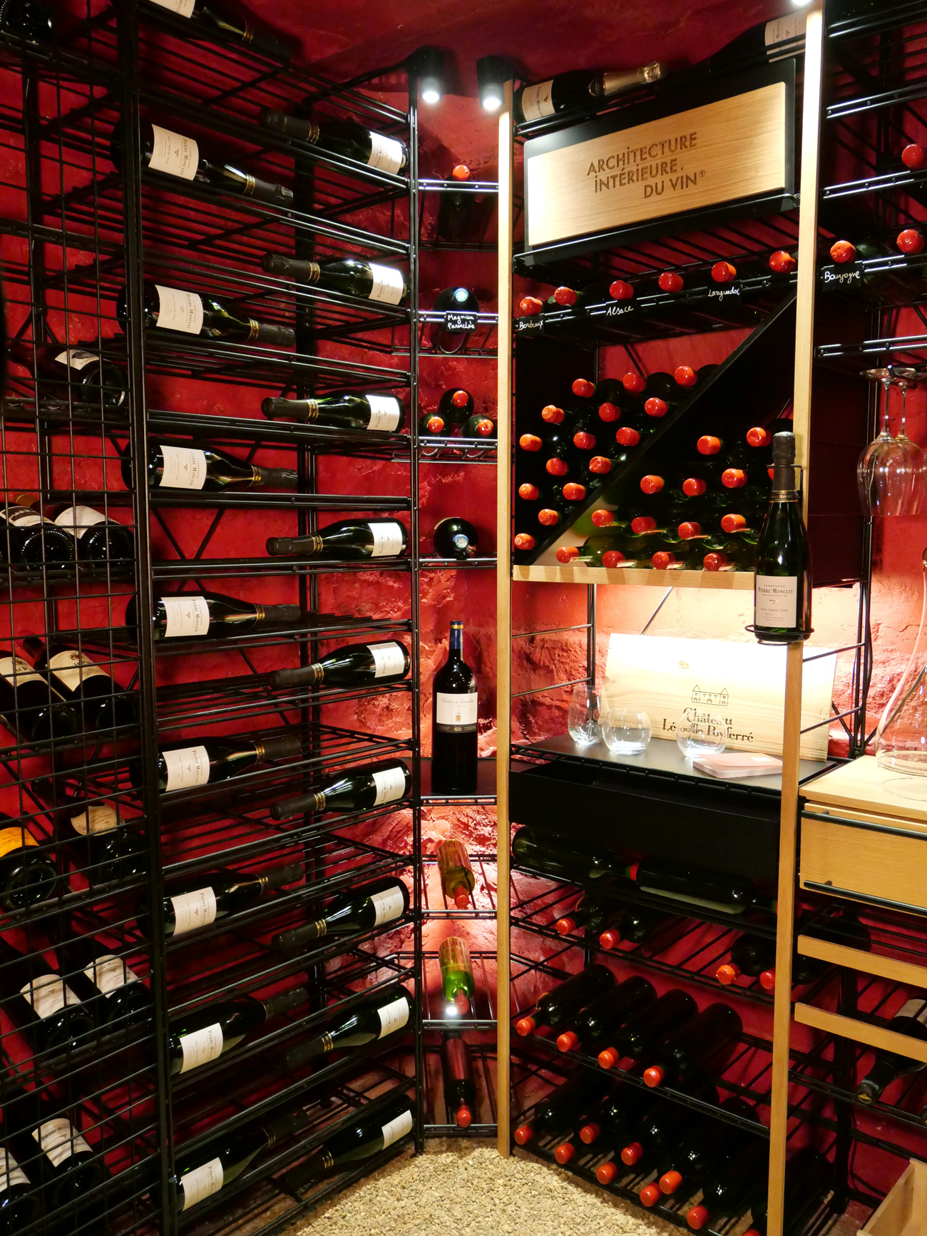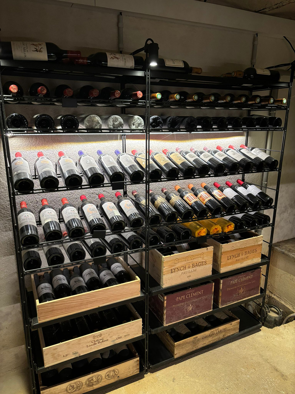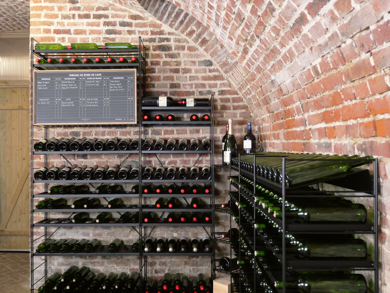 Une belle cave aérée & propre, sur son lit de graviers blancs, avec la signalétique adaptée pour bien repérer ses bouteilles, région par région.