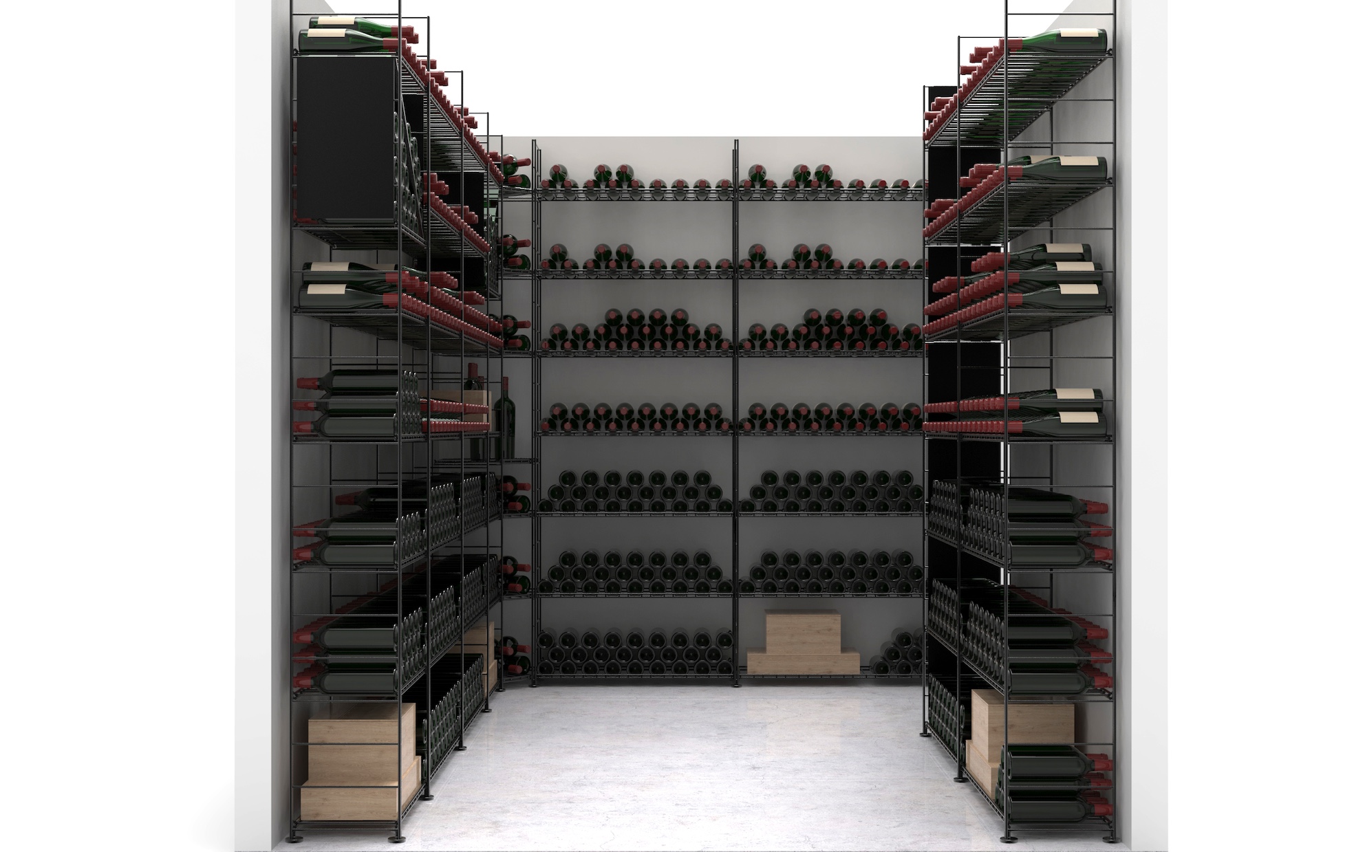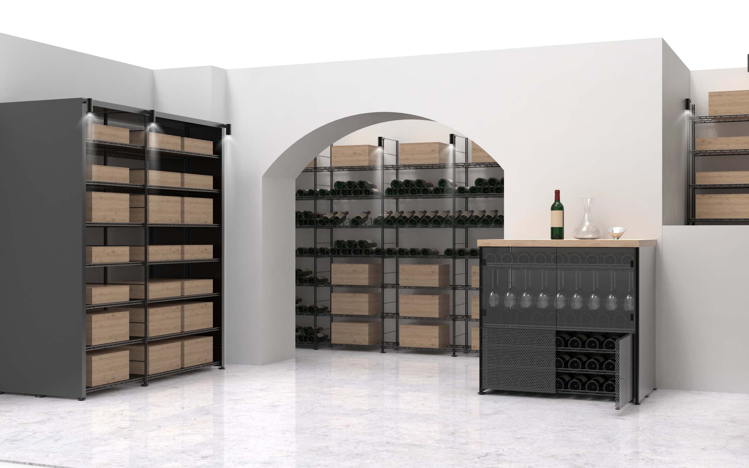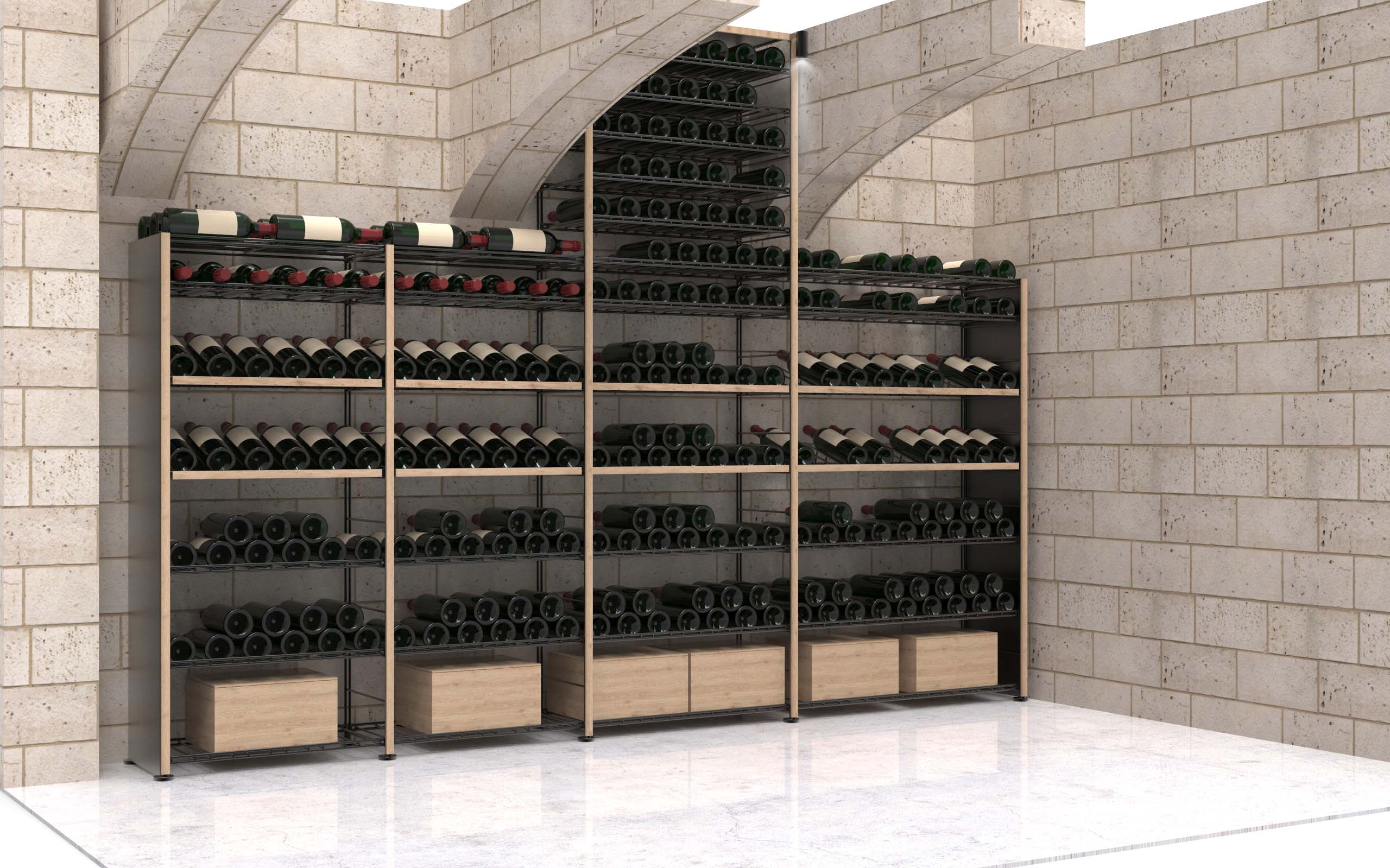 Une belle cave aérée & propre, sur son lit de graviers blancs, avec la signalétique adaptée pour bien repérer ses bouteilles, région par région.