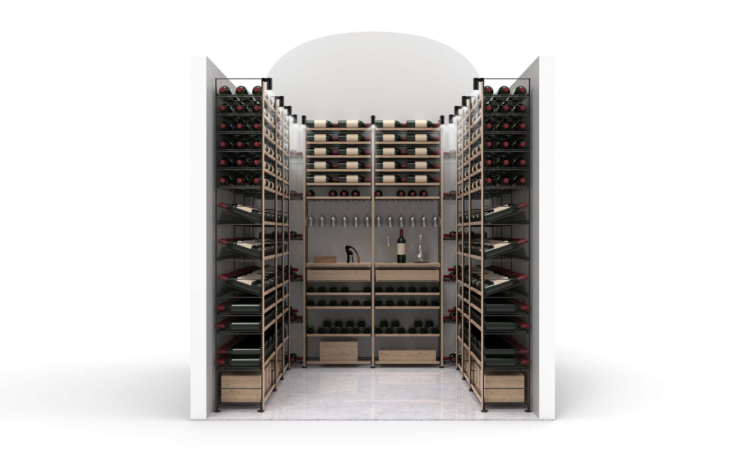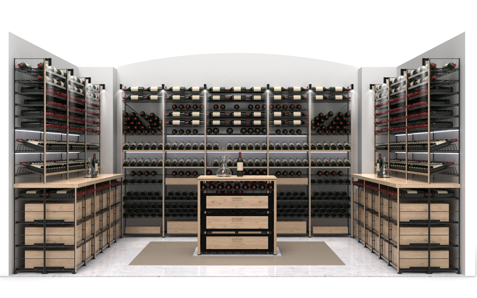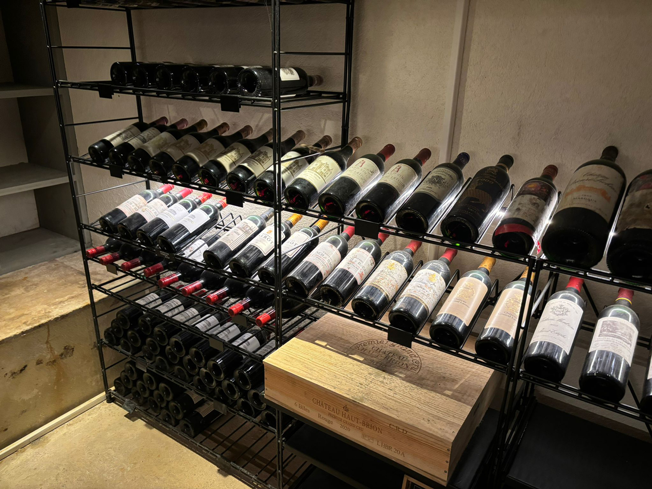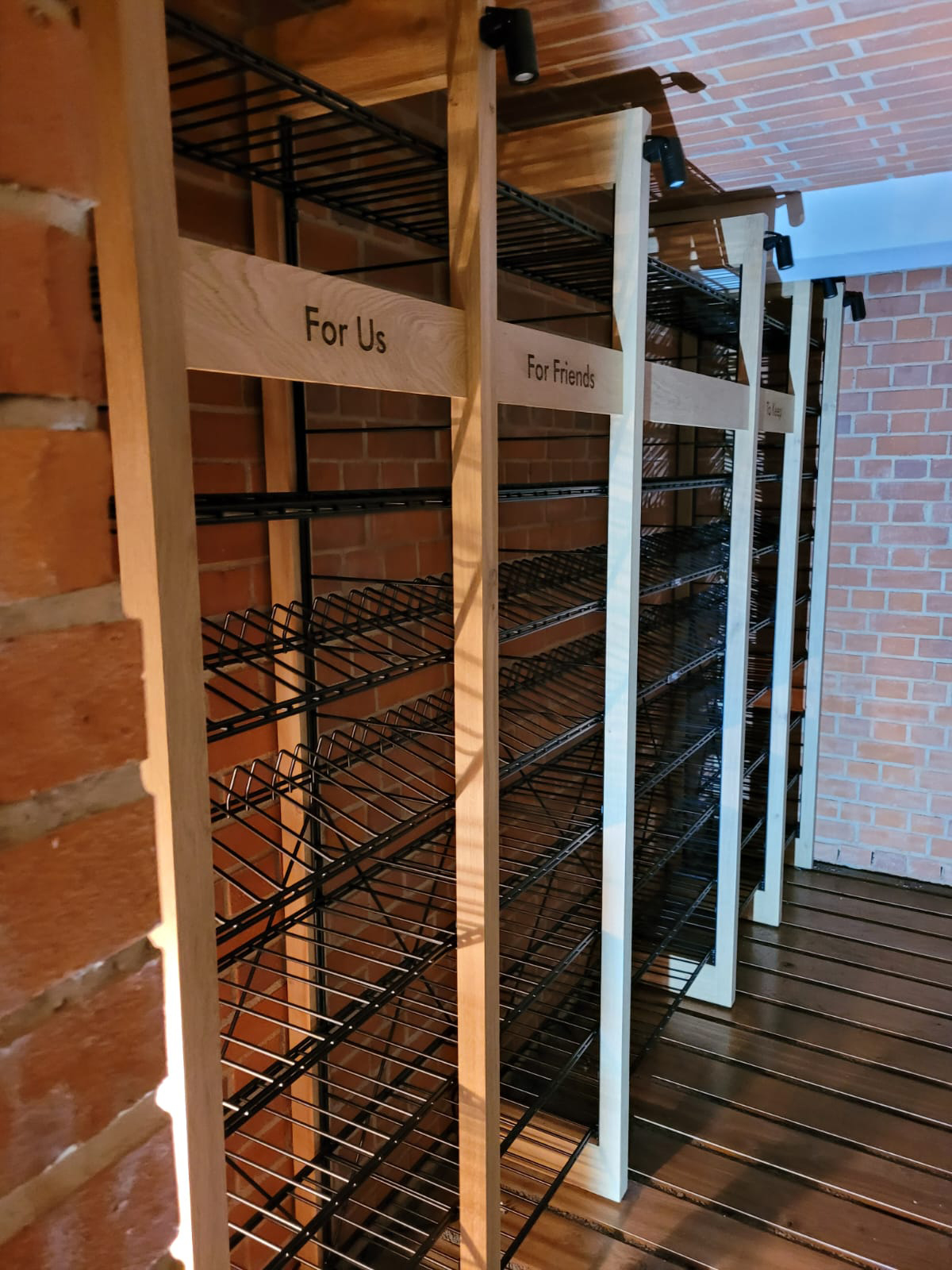Une belle cave aérée & propre, sur son lit de graviers blancs, avec la signalétique adaptée pour bien repérer ses bouteilles, région par région.