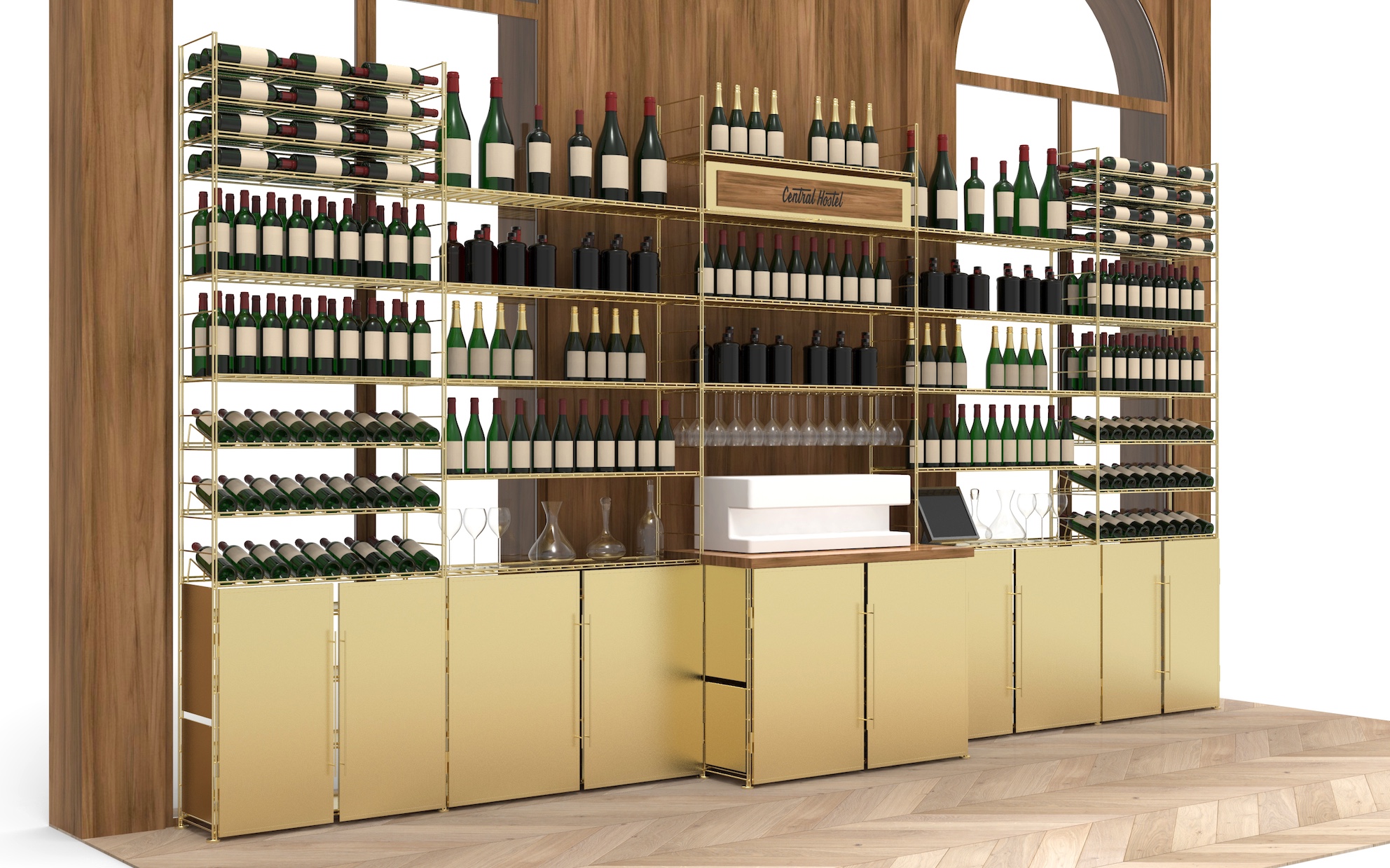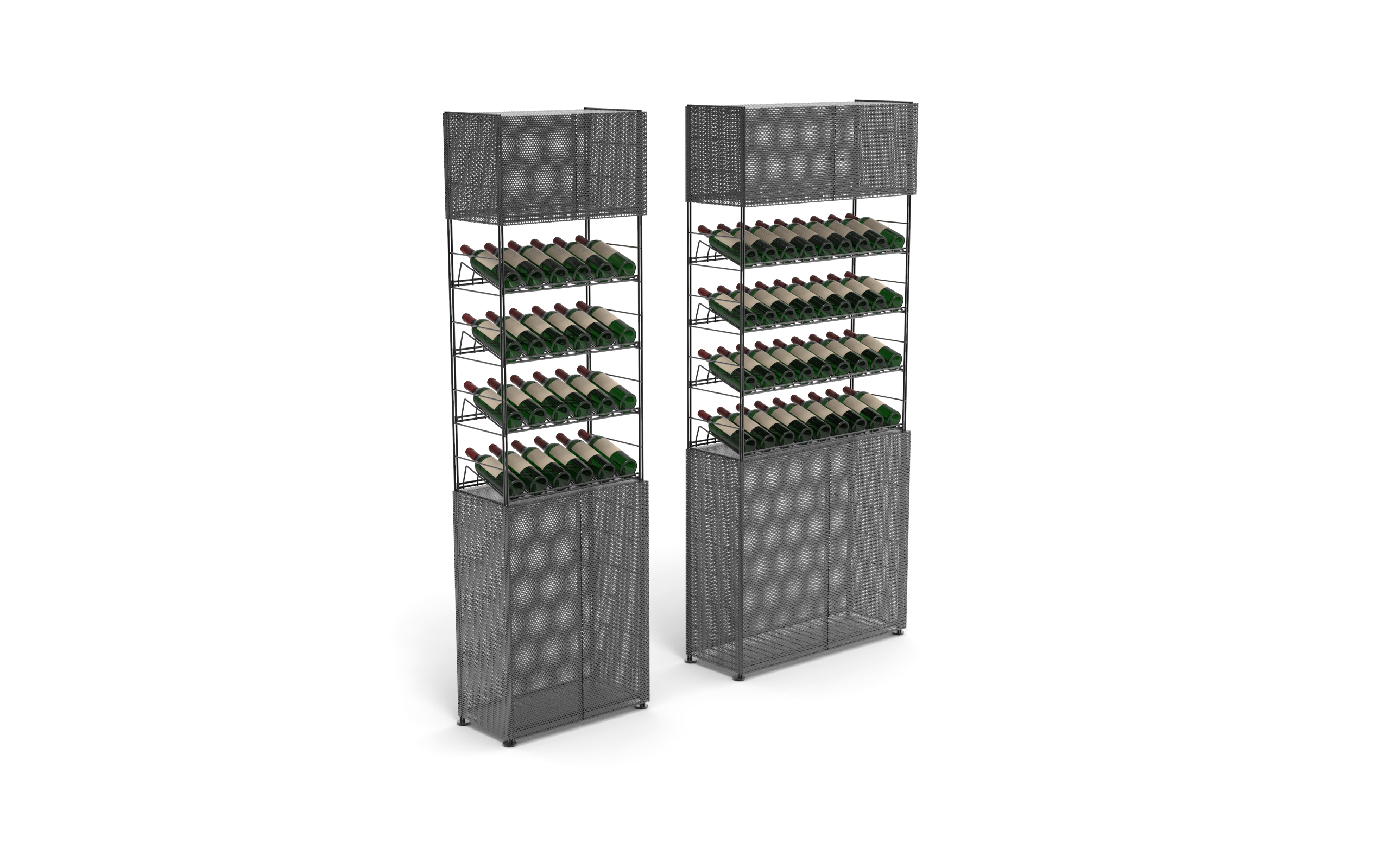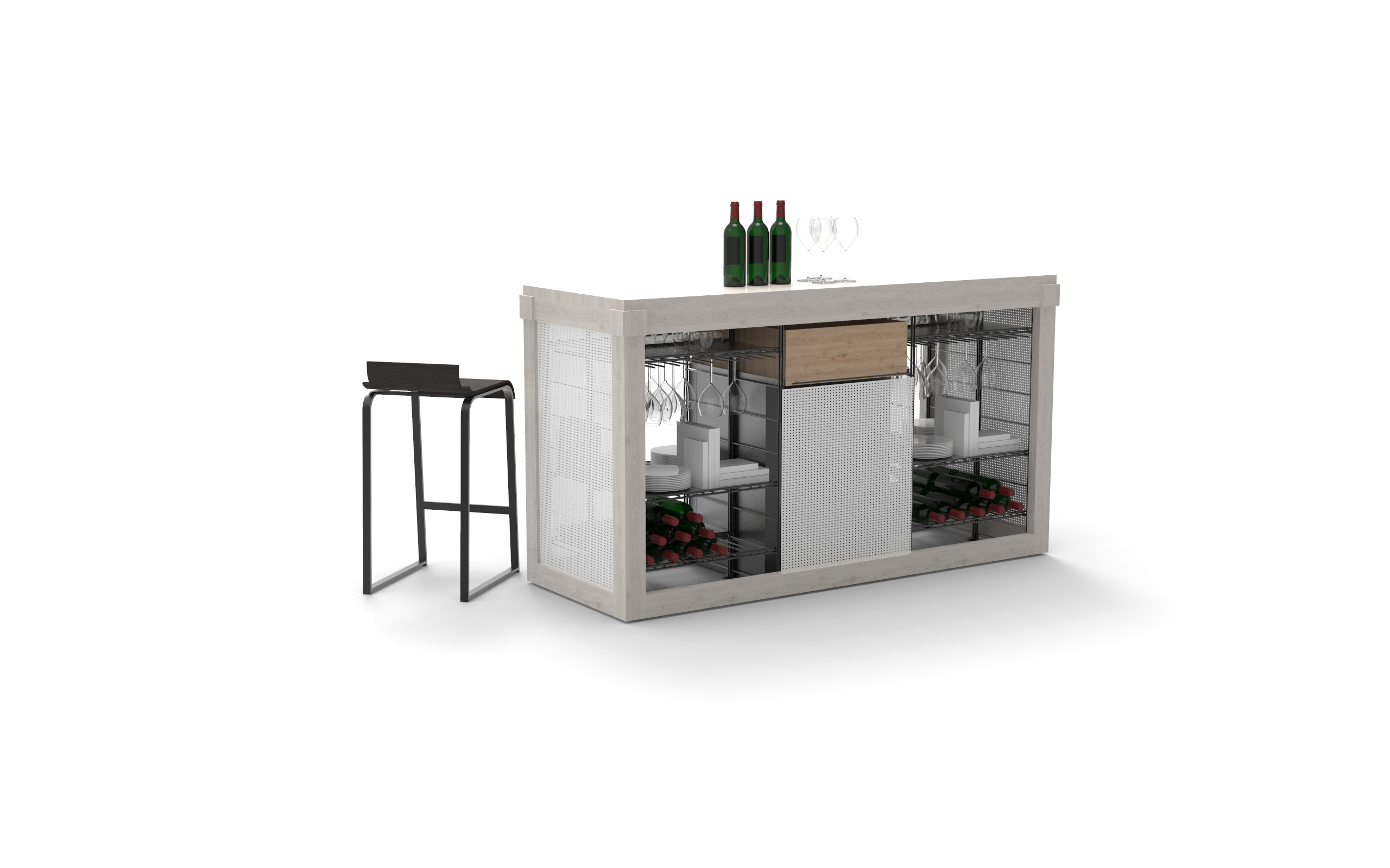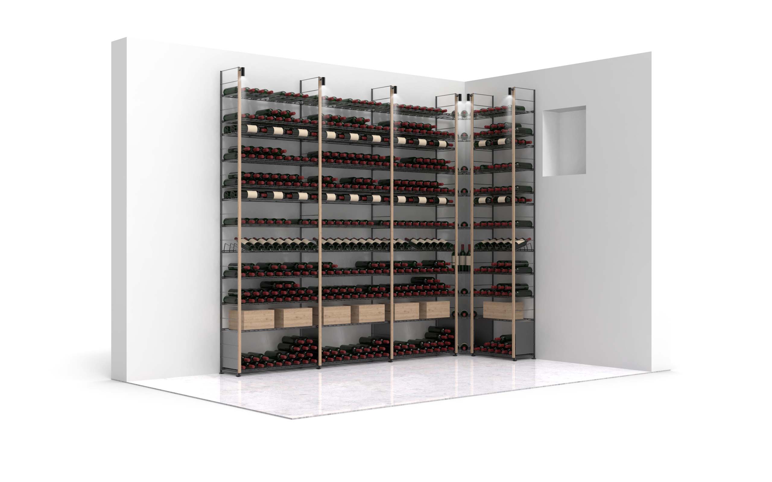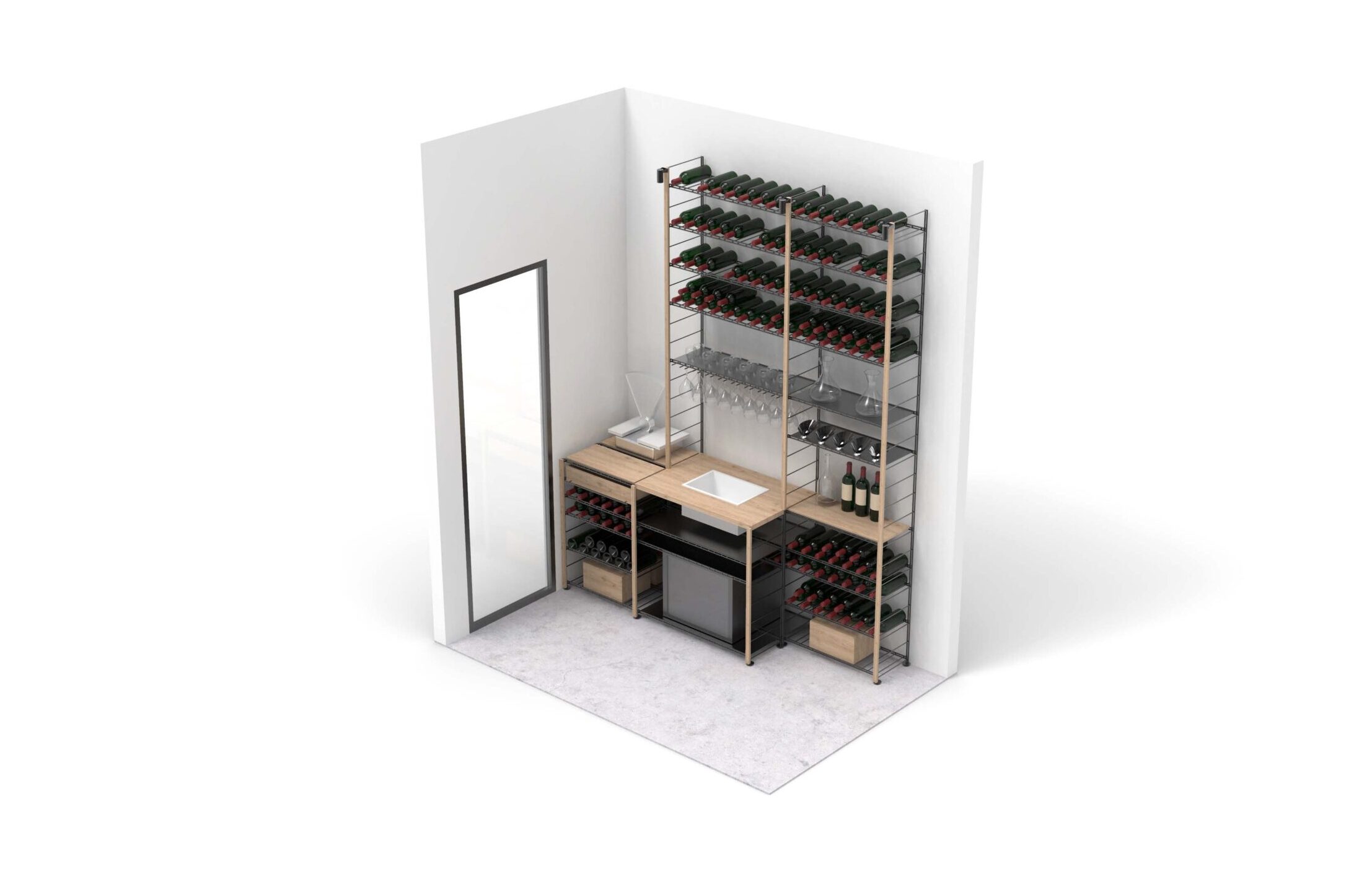 Garde-manger entièrement équipé avec nos Mobiliers de type Marchand de Vin, constitués de grands plateaux & de nombreuses options, dont des racks pour les verres, des tiroirs pour les rangements ou des plaques métal permettant de disposer des éléments debout.